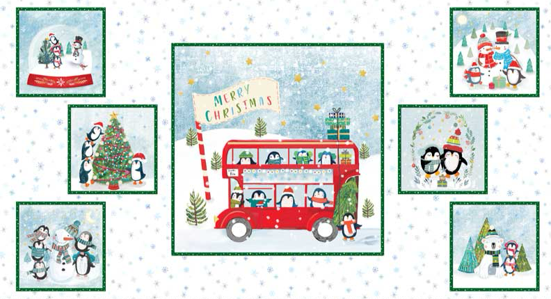 Penguins at play! Who knew that these sweet creatures could have so much fun! Sally Darby created this delightful Christmas collection that you're sure to love. A soft blue, green, and white palette lends an overall icy feel to these prints. The block panel features six small and one large block to get your creativity flowing! Terrific prints that can be used anywhere but especially fun to use for kids' décor…small tree skirts, Christmas backpack to take to Grandma's, or a gift tote to carry gifts to and from! Heidi Pridemore of The Whimsical Workshop has designed two complimentary projects…a holiday quilt as well as a tabletop set. So cute!